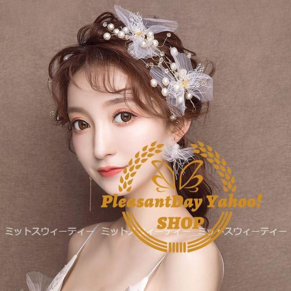 ヘアアクセサリー ヘッドドレス+イヤリング 前撮り ヘアコサージュ ウェディングヘアアクセサリー 髪飾り パール 花 結婚式 二次会 ブライダル チュール