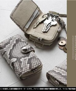 パイソンを使用した財布機能付きキーケースです。モラレスパイソン独特の斑紋や鱗模様の美しさが特徴です。 マット仕上げでウロコがより引き立ち、ソフトで手に馴染むしっとりとした感触です。 革自体は薄いのですがとても丈夫な革で鱗もしっかりしています。